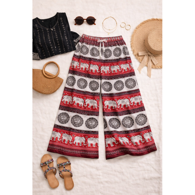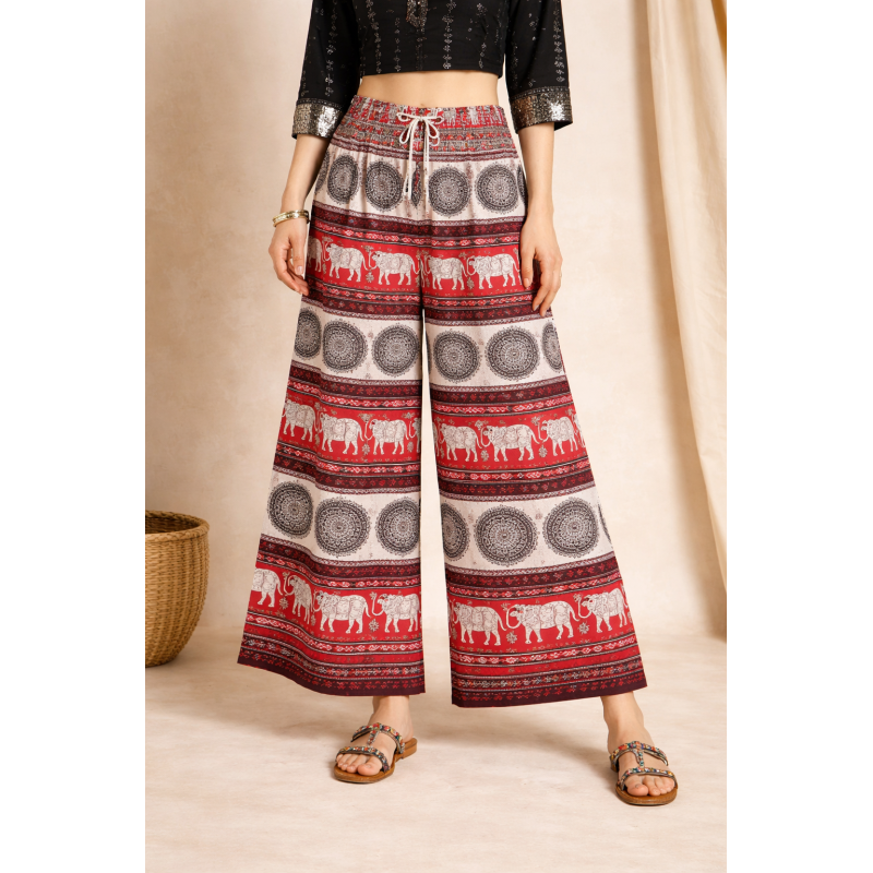 Make a bold ethnic statement with the PH Royal Red Elephant Palazzo, featuring soft breathable fabric and a graceful wide-leg flow.